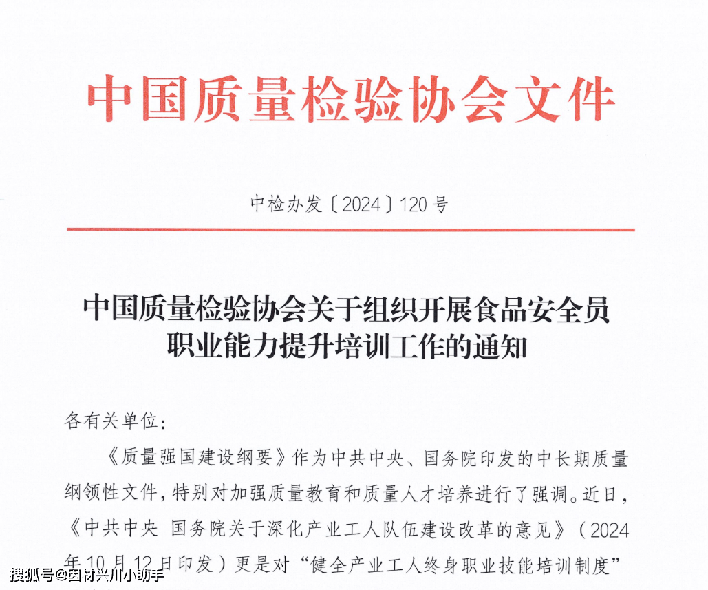 按照《食物平安法》、《劳动法》等法令律例的,按关决策摆设和《企业落实食物平安从体义务监视办理》(市场监管总局令第60号)等从管部分的政策要求,为了深切贯彻落实新时代人才强国计谋,督促泛博企业和查验检测机构提拔承担质量平安从体义务的能力,引领食物平安员精确把握其职责和权限并持续提拔岗亭履责能力,持续深切贯彻落实食物平安工做“四个最严”的要求,出力阐扬质量查验行业组织正在“党委带领、从导、政策支撑、企业从体、社会参取”高技强人才工做系统中不成或缺的积极感化,合力推进质量社会共治,帮力提拔食物平安员专业素养能力和程度,指导企业加强质量工做,推进企业产物和办事质量提拔,充实阐扬食物平安员正在产质量量提拔中的主要感化,办事高质量成长,推进质量强国扶植,中国质量查验协会组织开展食物平安员职业能力提拔培训工做。